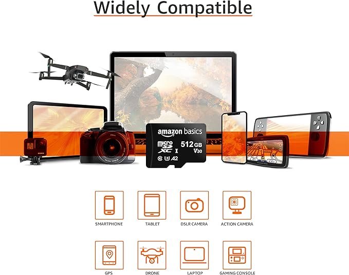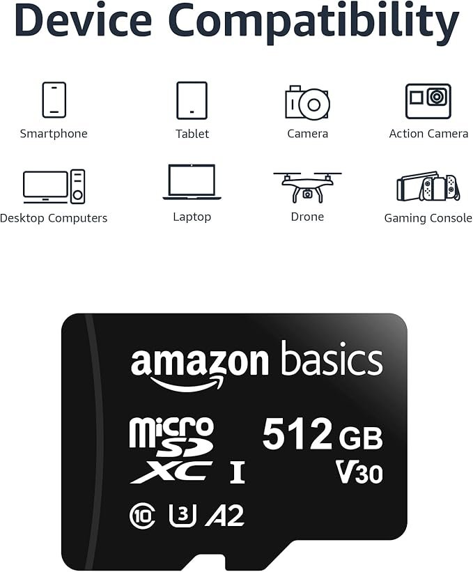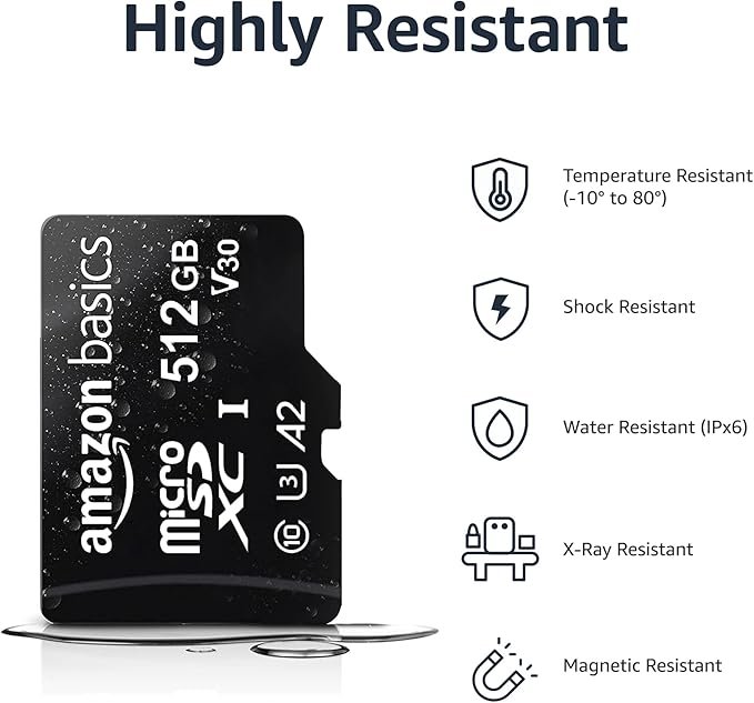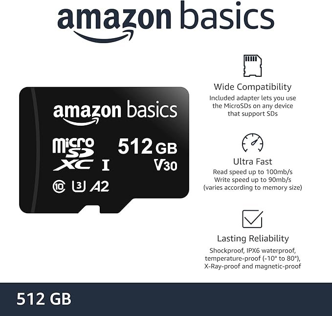Store more photos, 4K videos, and apps with the Amazon Basics 512 GB microSDXC card, featuring up to 100 MB/s read speed, UHS-I U3, A2 performance, and Class 10 reliability. Built tough for real-world use with shock-proof, IPX6-water-resistant, and temperature-resilient design (-10 °C to 80 °C), it’s perfect for smartphones, GoPros, drones, and more. Click to check latest pricing and compatibility.